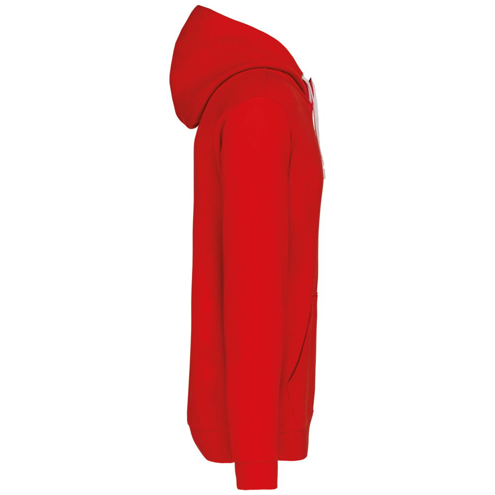 80% katoen / 20% polyester. Gekamd katoen. Geborsteld fleece aan de binnenkant. 'Kangaroe' zak aan de voorkant met gaatje voor draadje en lusje aan de kraag voor mp3-oortjes. Afwerking in ribboord. Gevoerde en gecontrasteerde capuchon met aanrijgkoordjes.