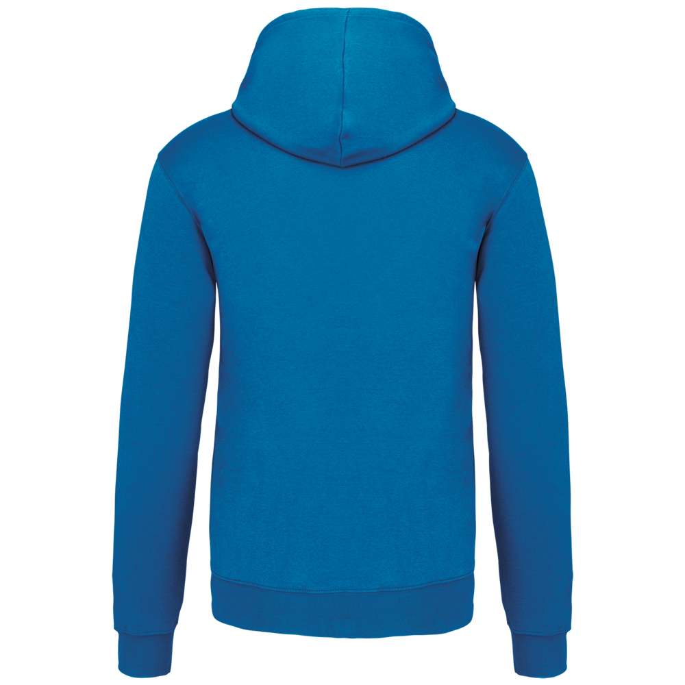 80% katoen / 20% polyester. Gekamd katoen. Geborsteld fleece aan de binnenkant. 'Kangaroe' zak aan de voorkant met gaatje voor draadje en lusje aan de kraag voor mp3-oortjes. Afwerking in ribboord. Gevoerde en gecontrasteerde capuchon met aanrijgkoordjes.