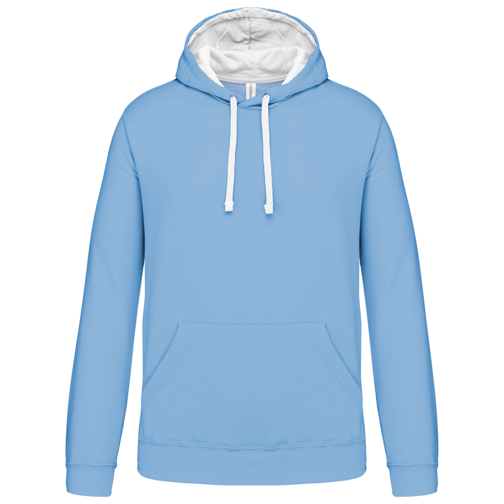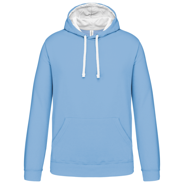 80% katoen / 20% polyester. Gekamd katoen. Geborsteld fleece aan de binnenkant. 'Kangaroe' zak aan de voorkant met gaatje voor draadje en lusje aan de kraag voor mp3-oortjes. Afwerking in ribboord. Gevoerde en gecontrasteerde capuchon met aanrijgkoordjes.