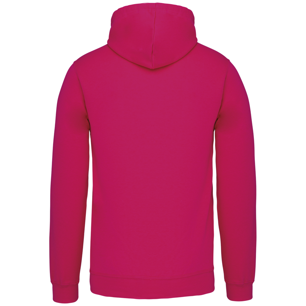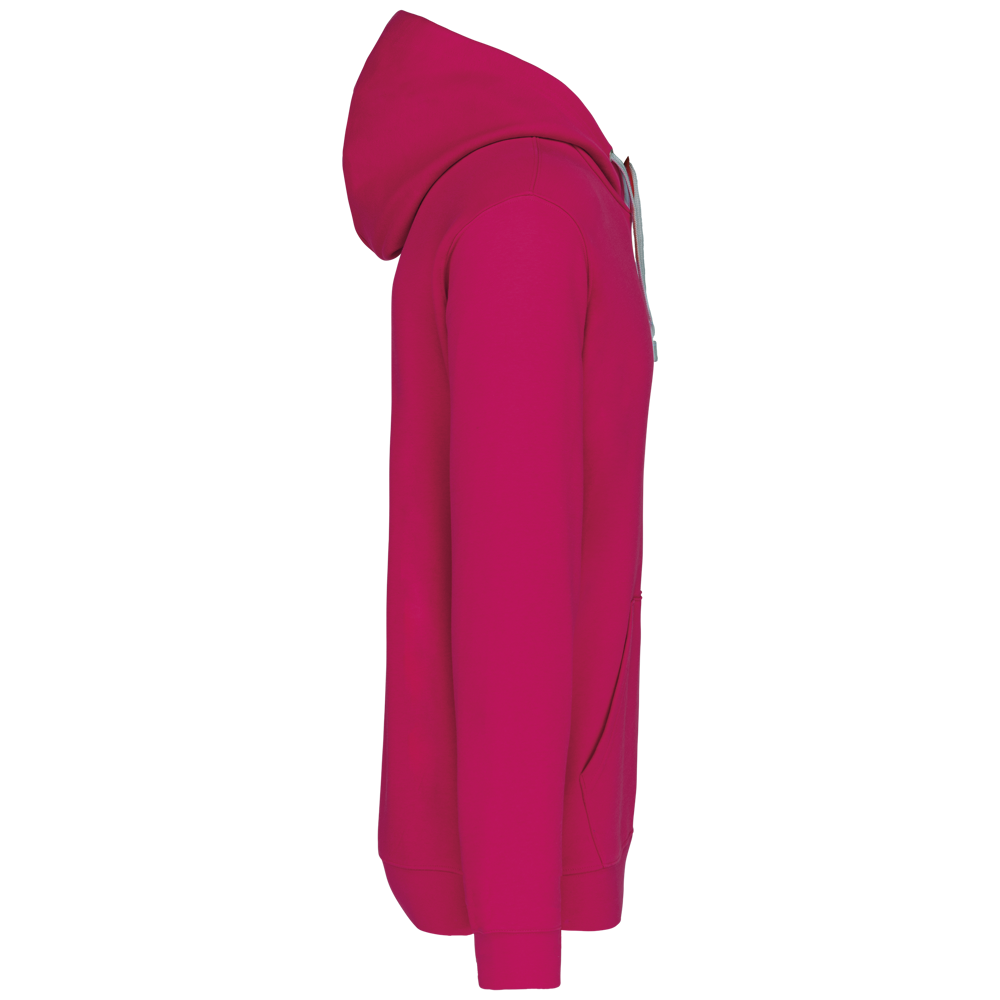 80% katoen / 20% polyester. Gekamd katoen. Geborsteld fleece aan de binnenkant. 'Kangaroe' zak aan de voorkant met gaatje voor draadje en lusje aan de kraag voor mp3-oortjes. Afwerking in ribboord. Gevoerde en gecontrasteerde capuchon met aanrijgkoordjes.