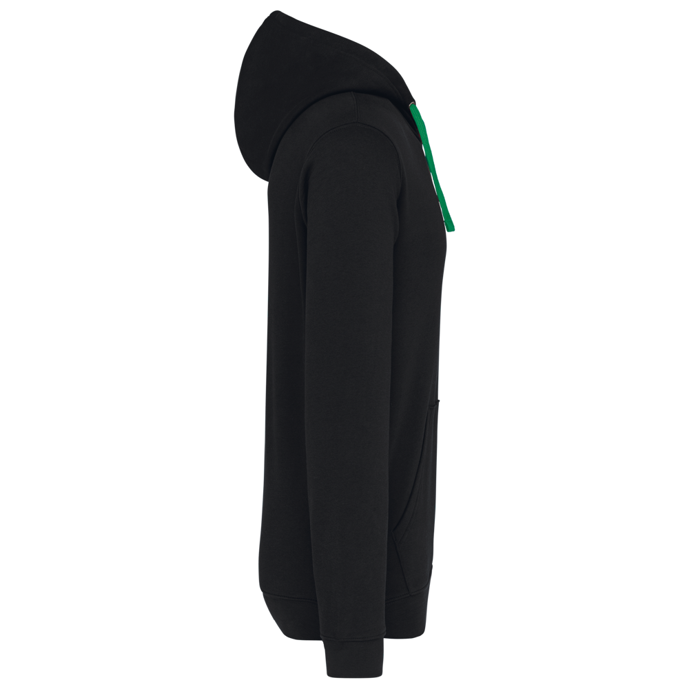 80% katoen / 20% polyester. Gekamd katoen. Geborsteld fleece aan de binnenkant. 'Kangaroe' zak aan de voorkant met gaatje voor draadje en lusje aan de kraag voor mp3-oortjes. Afwerking in ribboord. Gevoerde en gecontrasteerde capuchon met aanrijgkoordjes.