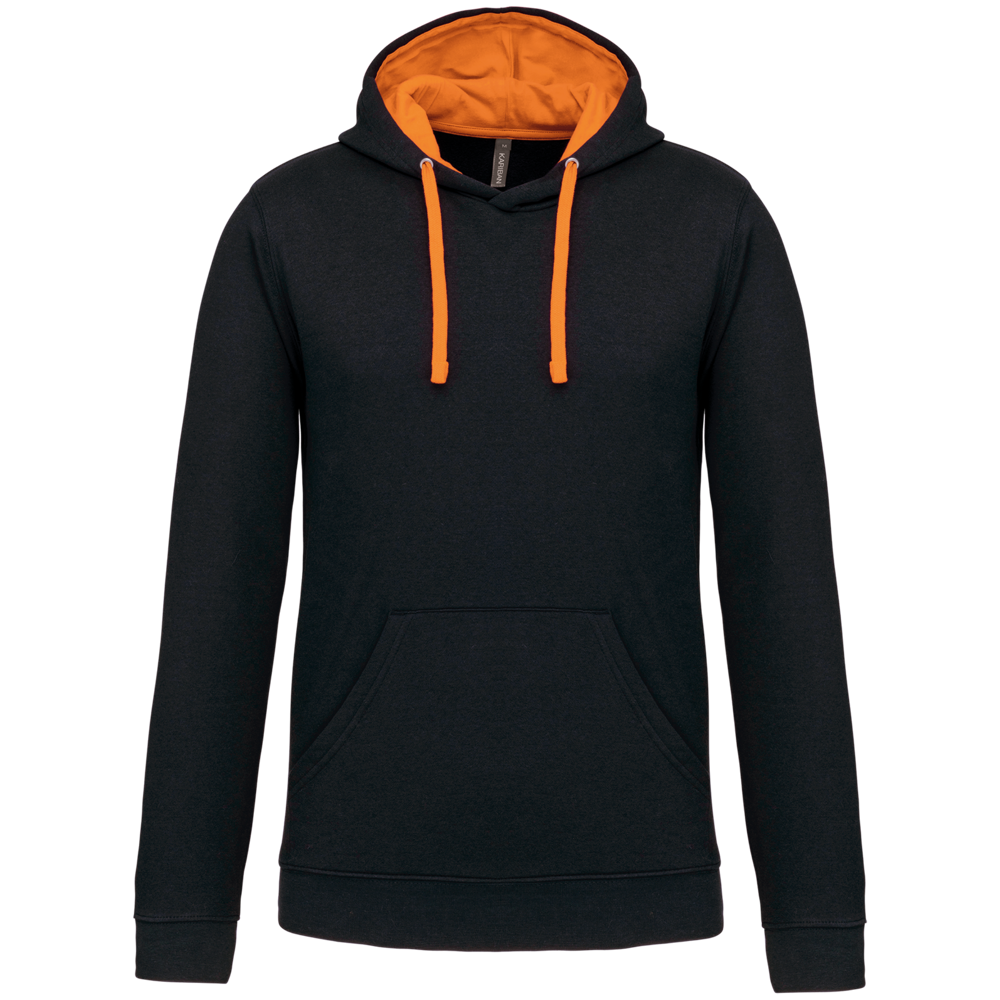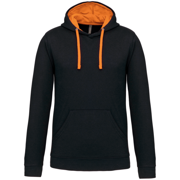 80% katoen / 20% polyester. Gekamd katoen. Geborsteld fleece aan de binnenkant. 'Kangaroe' zak aan de voorkant met gaatje voor draadje en lusje aan de kraag voor mp3-oortjes. Afwerking in ribboord. Gevoerde en gecontrasteerde capuchon met aanrijgkoordjes.