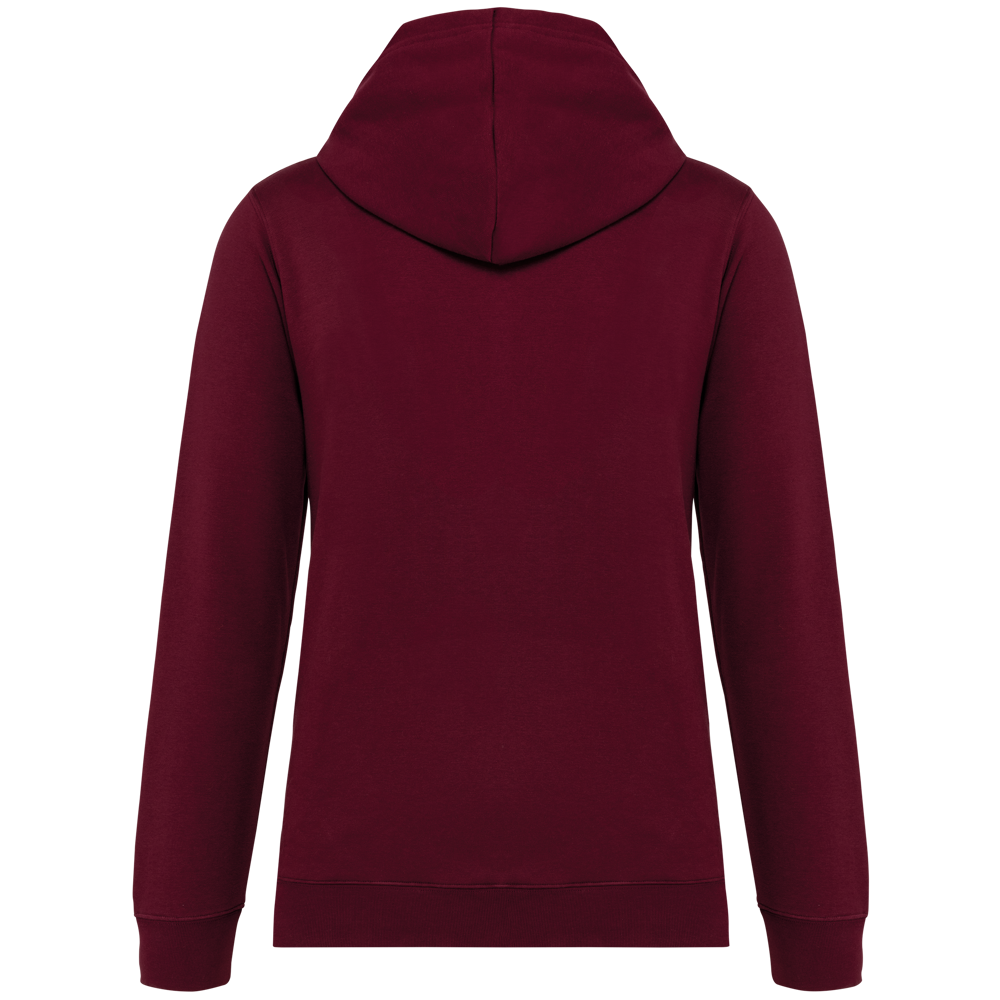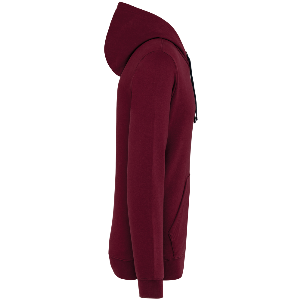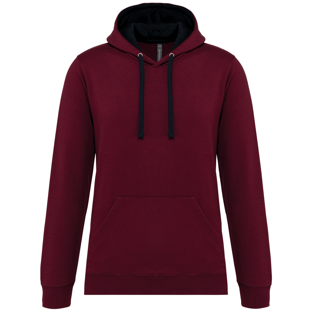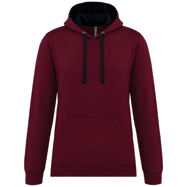 80% katoen / 20% polyester. Gekamd katoen. Geborsteld fleece aan de binnenkant. 'Kangaroe' zak aan de voorkant met gaatje voor draadje en lusje aan de kraag voor mp3-oortjes. Afwerking in ribboord. Gevoerde en gecontrasteerde capuchon met aanrijgkoordjes.