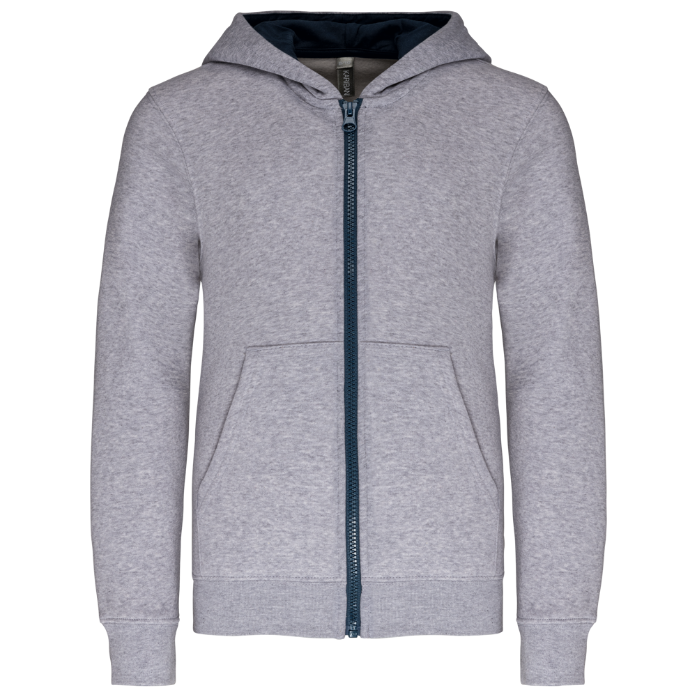 80% gekamd katoen / 20% polyester (Oxford Grey: 76% gekamd katoen / 21% polyester / 3% viscose). Geborsteld fleece aan de binnenkant. Ribboord aan mouwuiteinden en onderkant kledingstuk. Gevoerde capuchon in contrasterende kleur. Contrasterende rits. Opening voor headset-snoer in de kangoeroezak en halsopening.