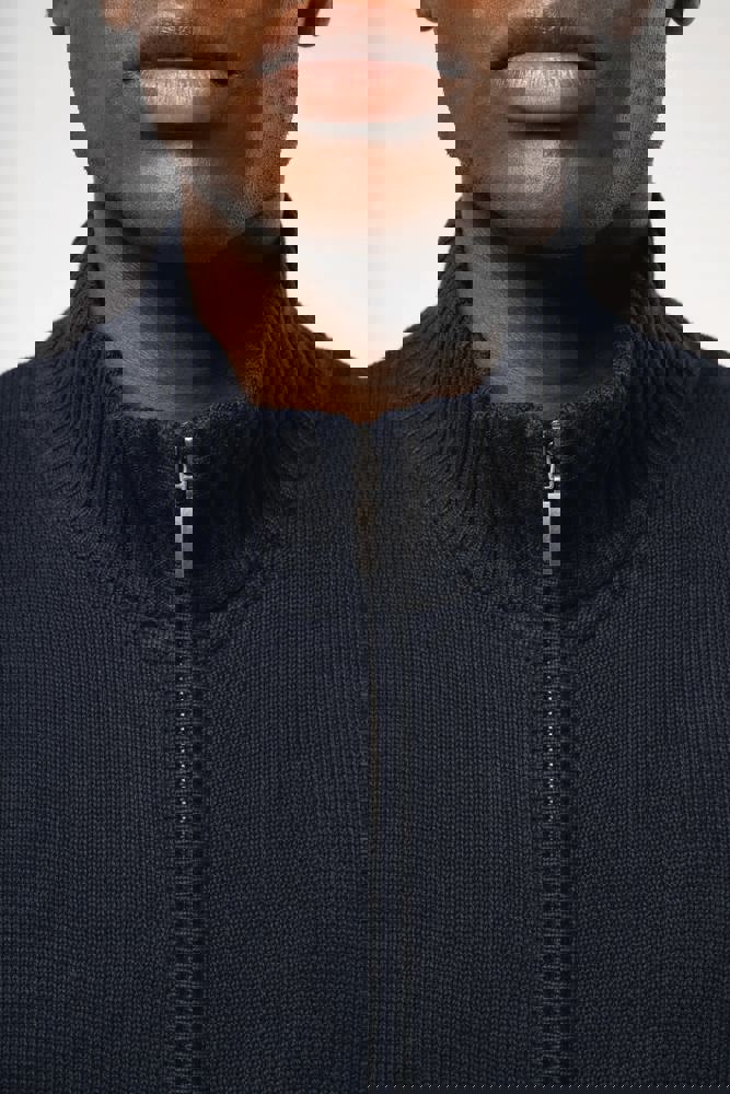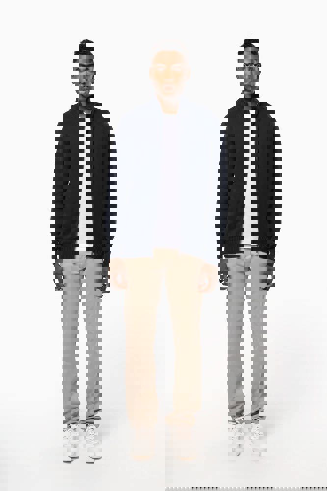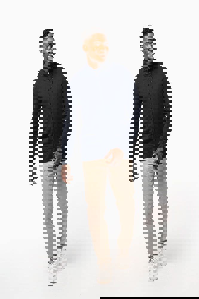 100% katoen. Opstaande 2-laagse kraag. Metaalkleurige ritssluiting. Nektape.