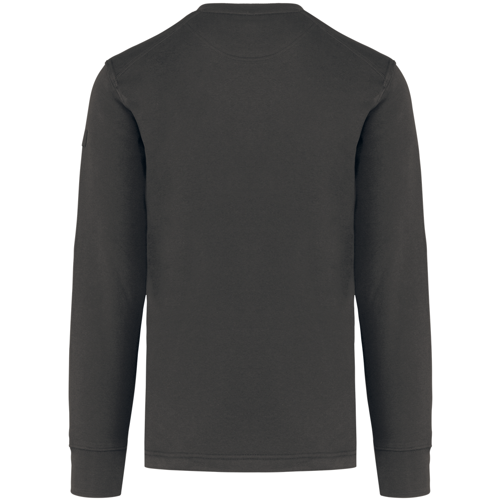 80% katoen / 20% polyester. Fleece 3 draden met LSF-behandeling (Low Shrinkage Fleece). Wasbaar op 60 °C. Ronde hals en mouwuiteinden in ribboord. Onzichtbare ritszak rechterzijkant. Versteviging op de schouders en ellebogen. Penhouder op de linkermouw. Halvemaanvormige afwerking op de achterkant. Ophanglus in de kraag. Afwerking met dubbel stiksel onderaan en verlengd achterpand voor meer comfort.