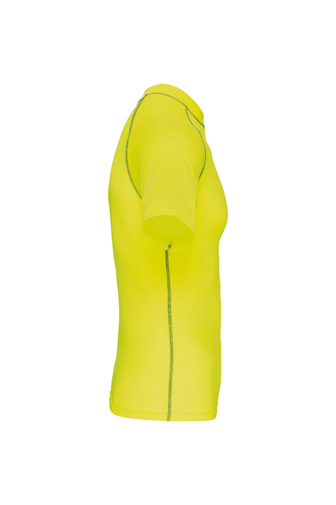 88% polyester / 12% elasthan. Stretchtricot. Bescherming UV 40+ in overeenstemming met de EN13758-1&2-norm. Korte mouwen. Opstaande kraag. Heel nauw aansluitende snit. Elastische gesp in de zoom vooraan om het koordje van de short door te steken en het T-shirt zo op zijn plaats te houden. Contrasterende stiksels. Mouwuiteinden en onderkant afgewerkt met dubbel stiksel.