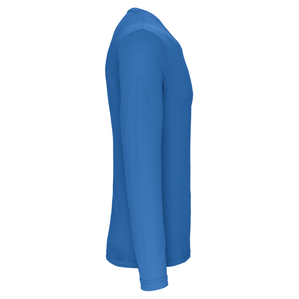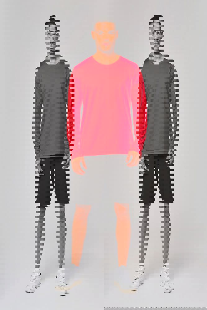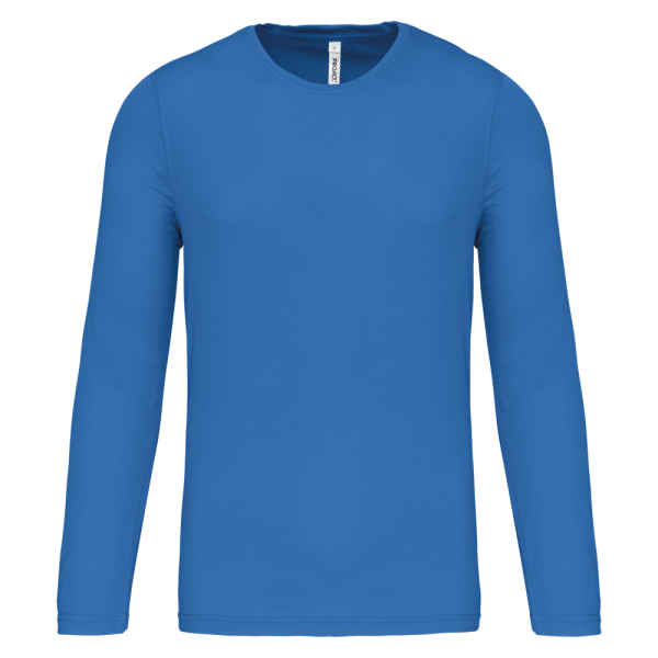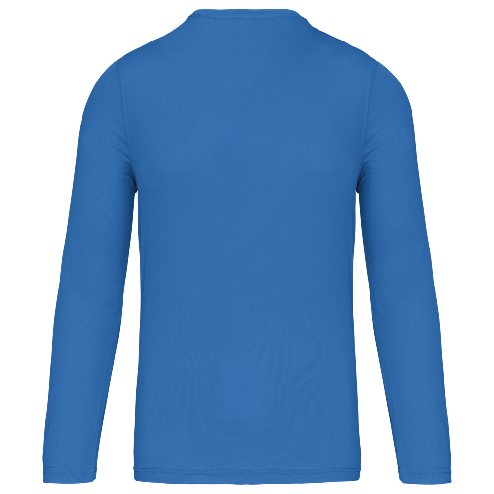 100% polyester. Sneldrogende lichte stof. Ronde hals. Nektape. Afwerking met dubbele stiksels aan de mouwuiteinden en onderkant.