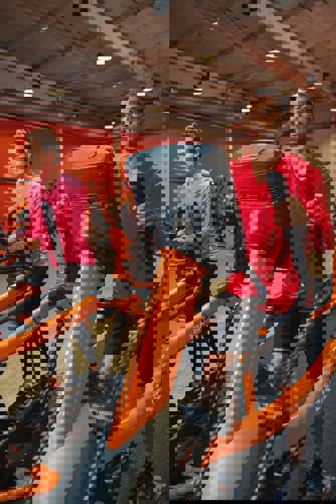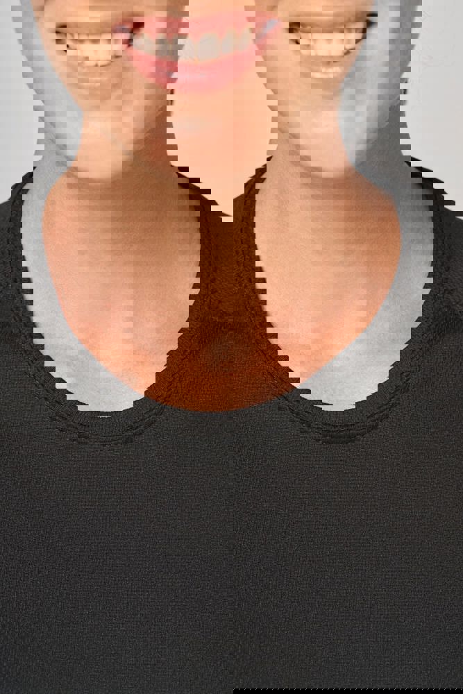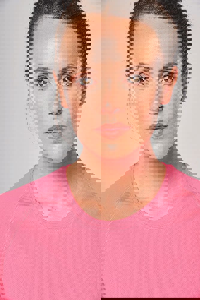 100% polyester. Sneldrogende lichte stof. Ronde hals. Nektape. Afwerking met dubbele stiksels aan de mouwuiteinden en onderkant.
