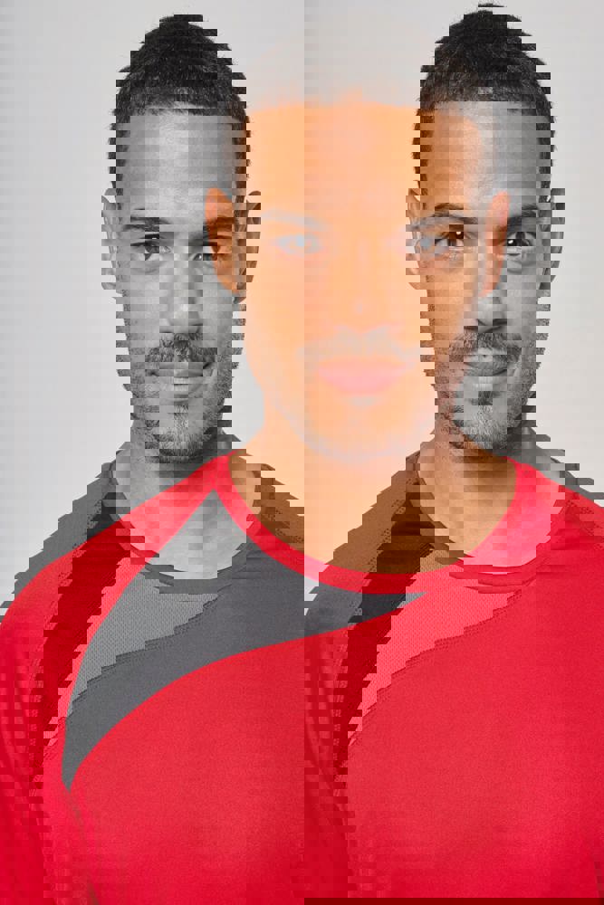 100% polyester. Inzetstukken in contrastkleur op de borst en mouwuiteinde. Overstiksels toon op toon. Afwerking met dubbele stiksels onderaan en aan de mouwuiteinden.