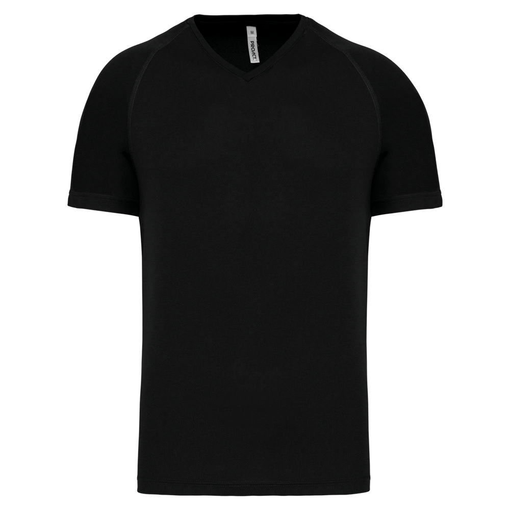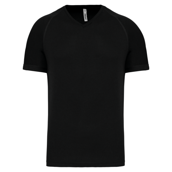 100% polyester. Sneldrogende stof. V-hals met nektape. Raglanmouwen met overlocksteek. Dubbel stiksel aan de mouwuiteinden en onderkant kledingstuk.