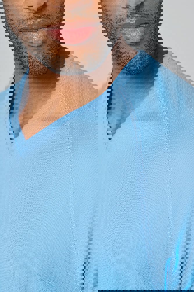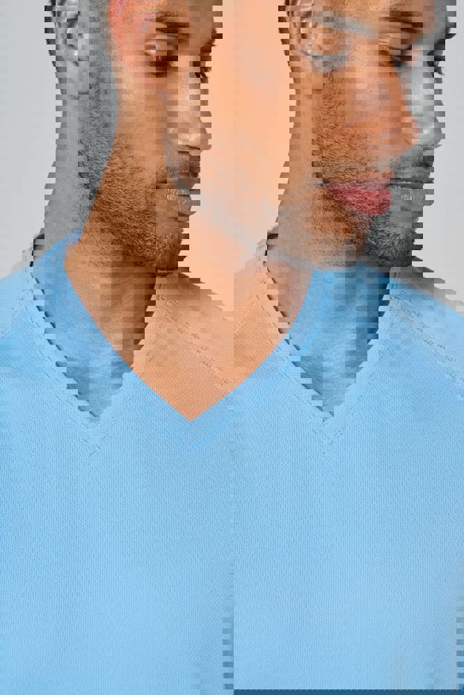 100% polyester. Sneldrogende stof. V-hals met nektape. Raglanmouwen met overlocksteek. Dubbel stiksel aan de mouwuiteinden en onderkant kledingstuk.