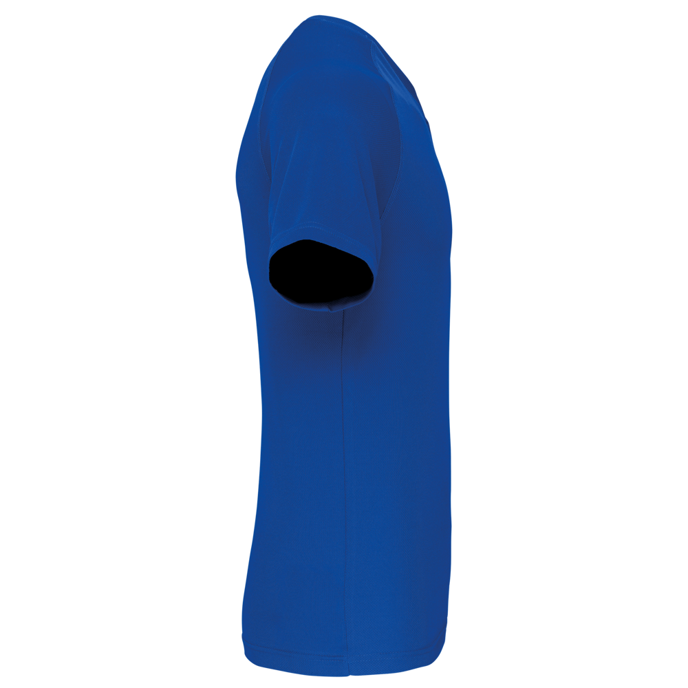 100% polyester. Sneldrogende stof. V-hals met nektape. Raglanmouwen met overlocksteek. Dubbel stiksel aan de mouwuiteinden en onderkant kledingstuk.