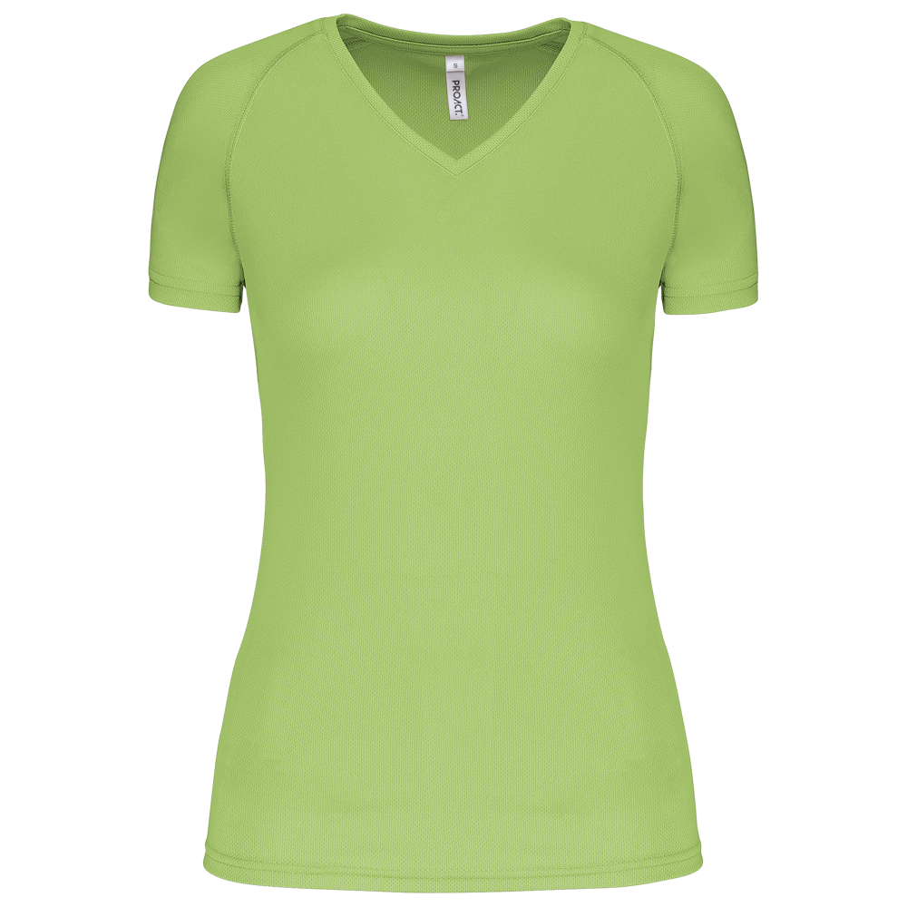 100% polyester. Sneldrogende stof. V-hals met nektape. Raglanmouwen met overlocksteek. Dubbel stiksel aan de mouwuiteinden en onderkant kledingstuk.