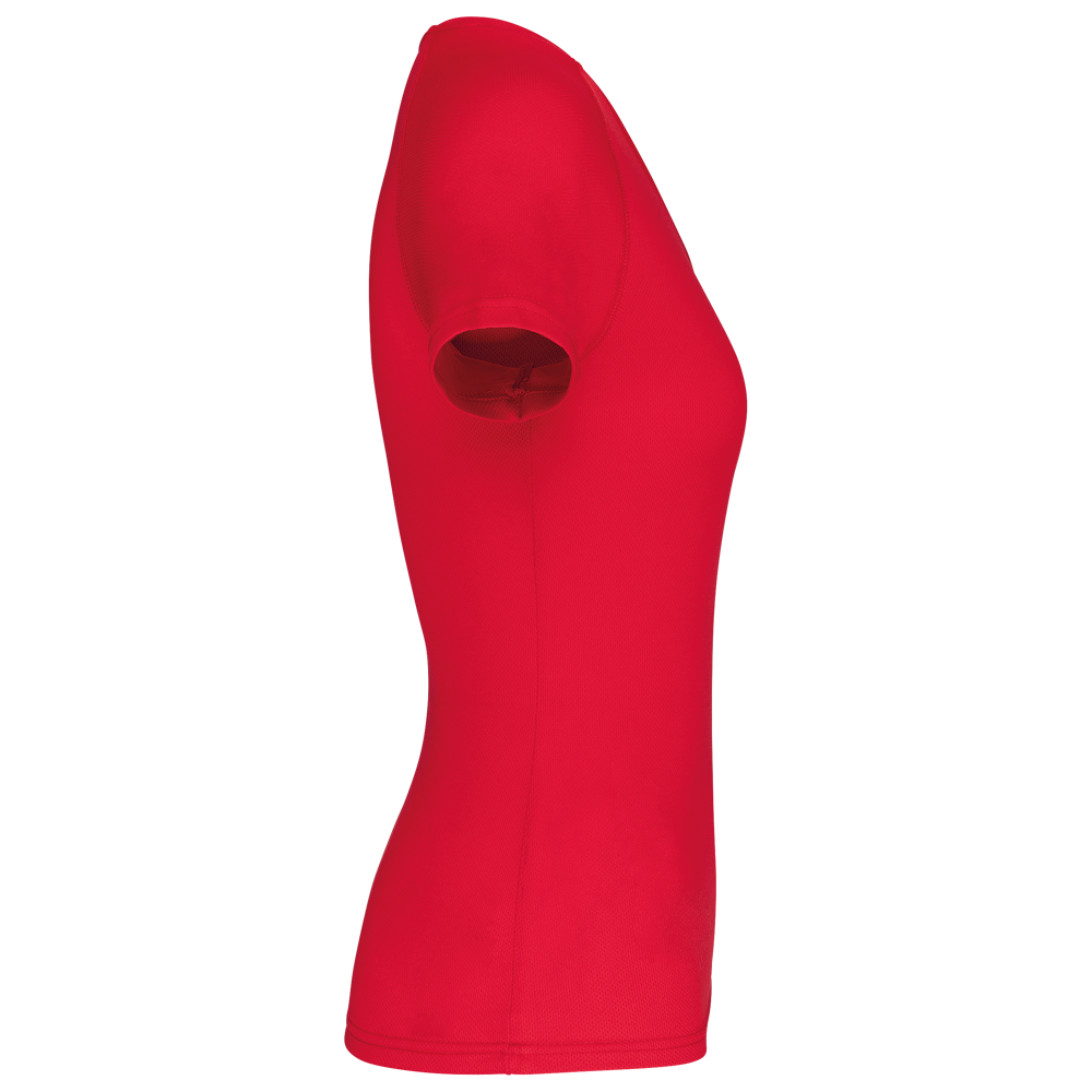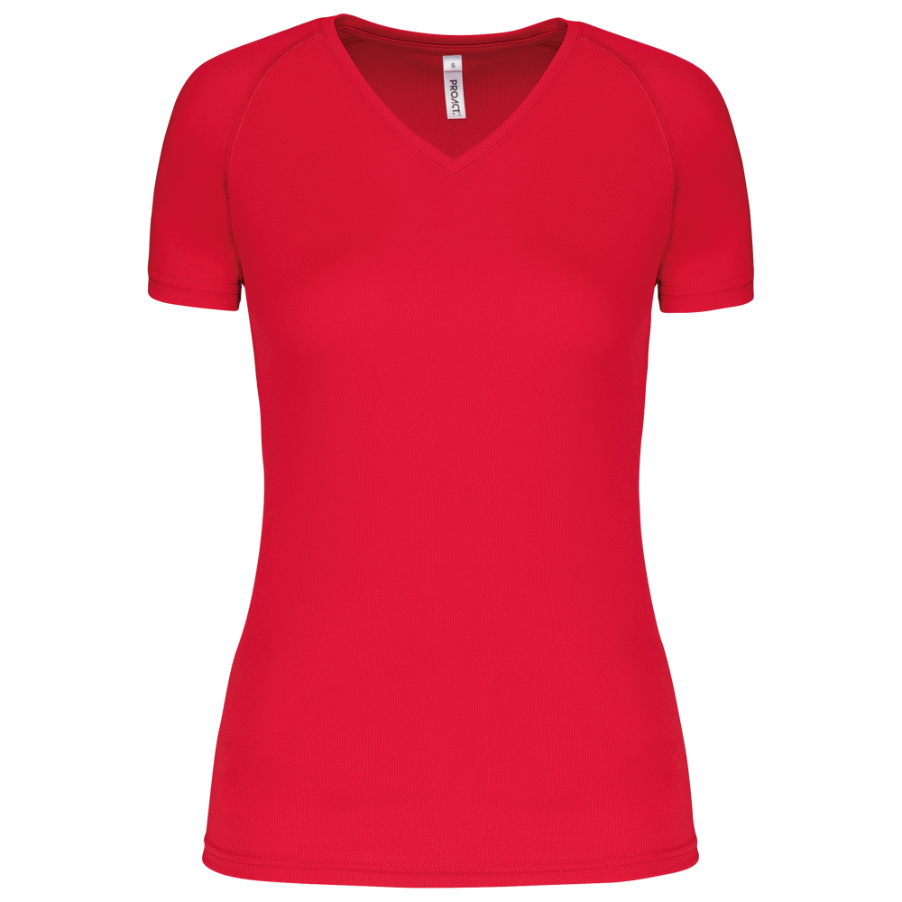 100% polyester. Sneldrogende stof. V-hals met nektape. Raglanmouwen met overlocksteek. Dubbel stiksel aan de mouwuiteinden en onderkant kledingstuk.