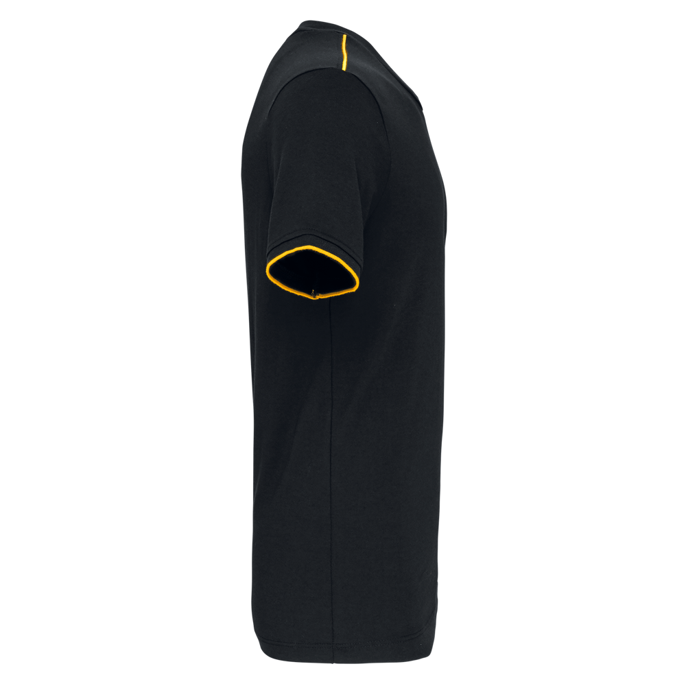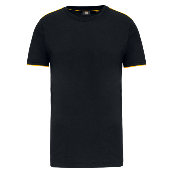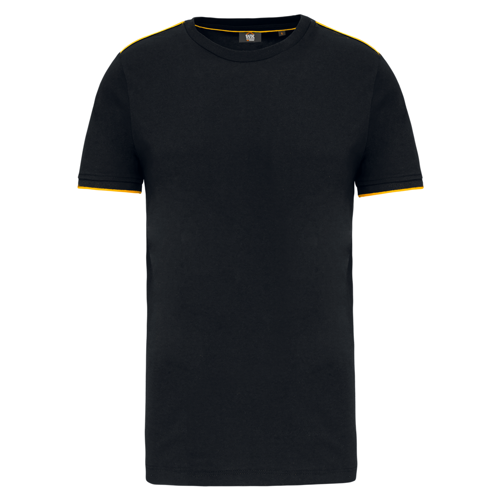 65% polyester / 35% katoen. Gekamd katoen jerseystof. Wasbaar op 60 °C. Anti-pluisbehandeling. Ronde hals met elasthan. Contrasterende bies aan binnenkant kraag en schouders. Mouwuiteinden in ribboord met contrasterend biesje. Afwerking met dubbel stiksel onderaan. Ideaal voor dagelijks gebruik.