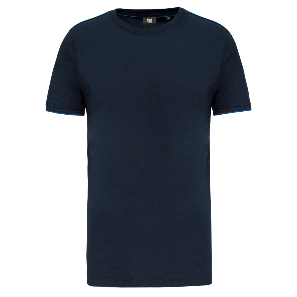 65% polyester / 35% katoen. Gekamd katoen jerseystof. Wasbaar op 60 °C. Anti-pluisbehandeling. Ronde hals met elasthan. Contrasterende bies aan binnenkant kraag en schouders. Mouwuiteinden in ribboord met contrasterend biesje. Afwerking met dubbel stiksel onderaan. Ideaal voor dagelijks gebruik.