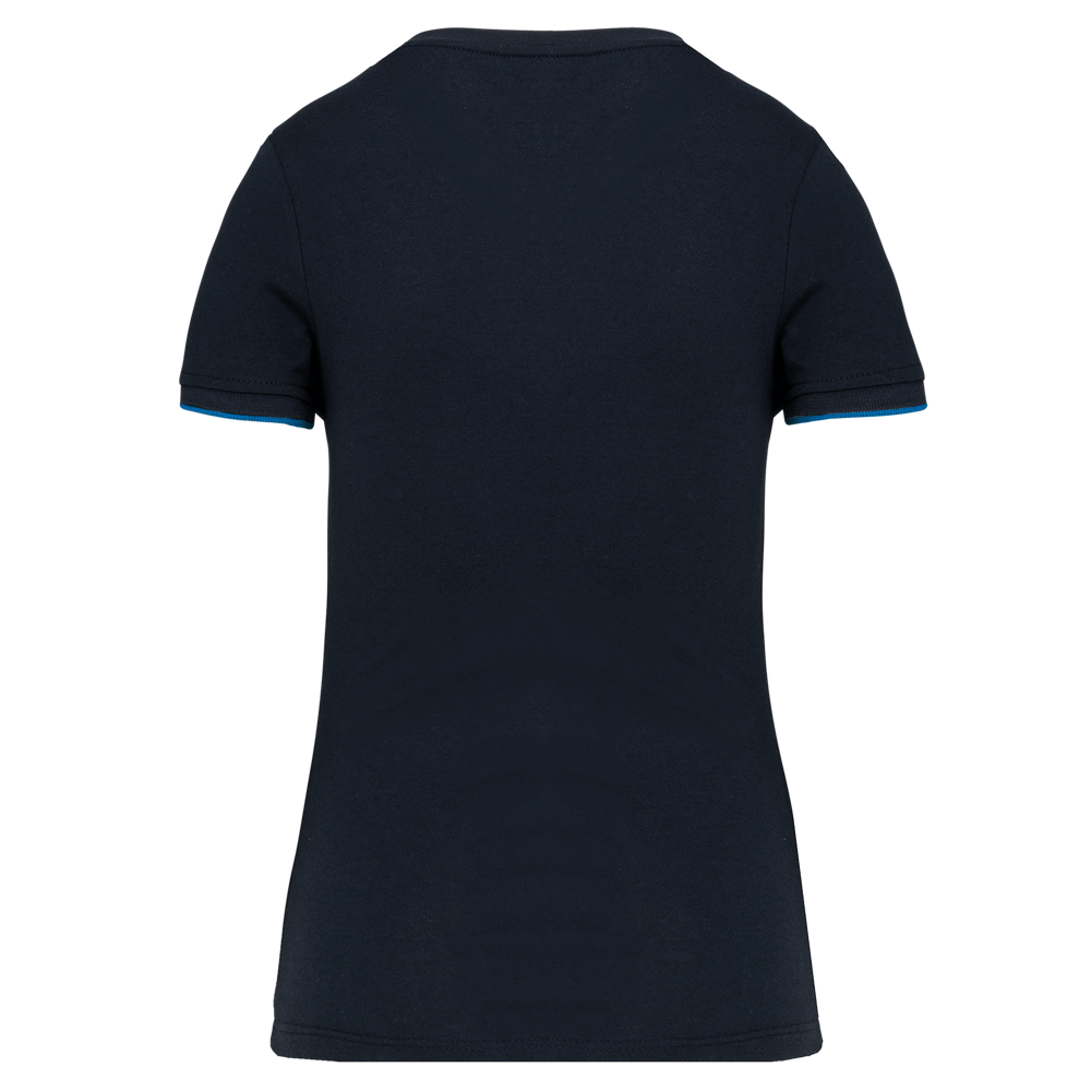 65% polyester / 35% katoen. Gekamd katoen jerseystof. Wasbaar op 60 °C. Anti-pluisbehandeling. Ronde hals met elasthan. Contrasterende bies aan binnenkant kraag en schouders. Mouwuiteinden in ribboord met contrasterend biesje. Afwerking met dubbel stiksel onderaan. Ideaal voor dagelijks gebruik.