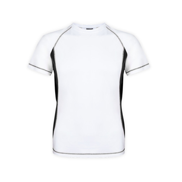 Sport T-shirt voor volwassenen van 100% ademend polyester 135 g / m2. Ontwerp in het wit met verstevigingsnaden en felgekleurde zijkanten. Verkrijgbaar in de maten S, M, L, XL, XXL.