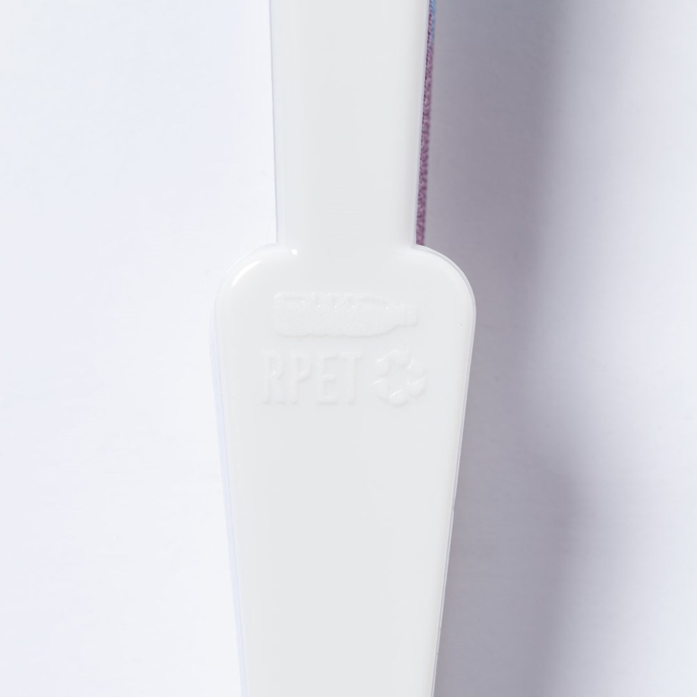 Regenboogwaaier met veelkleurige stof en witte RPET-ribben. Een waaier om trots op te zijn, met het RPET-kenmerk in de mal gegoten.Gepresenteerd in een individuele witte doos met venster.